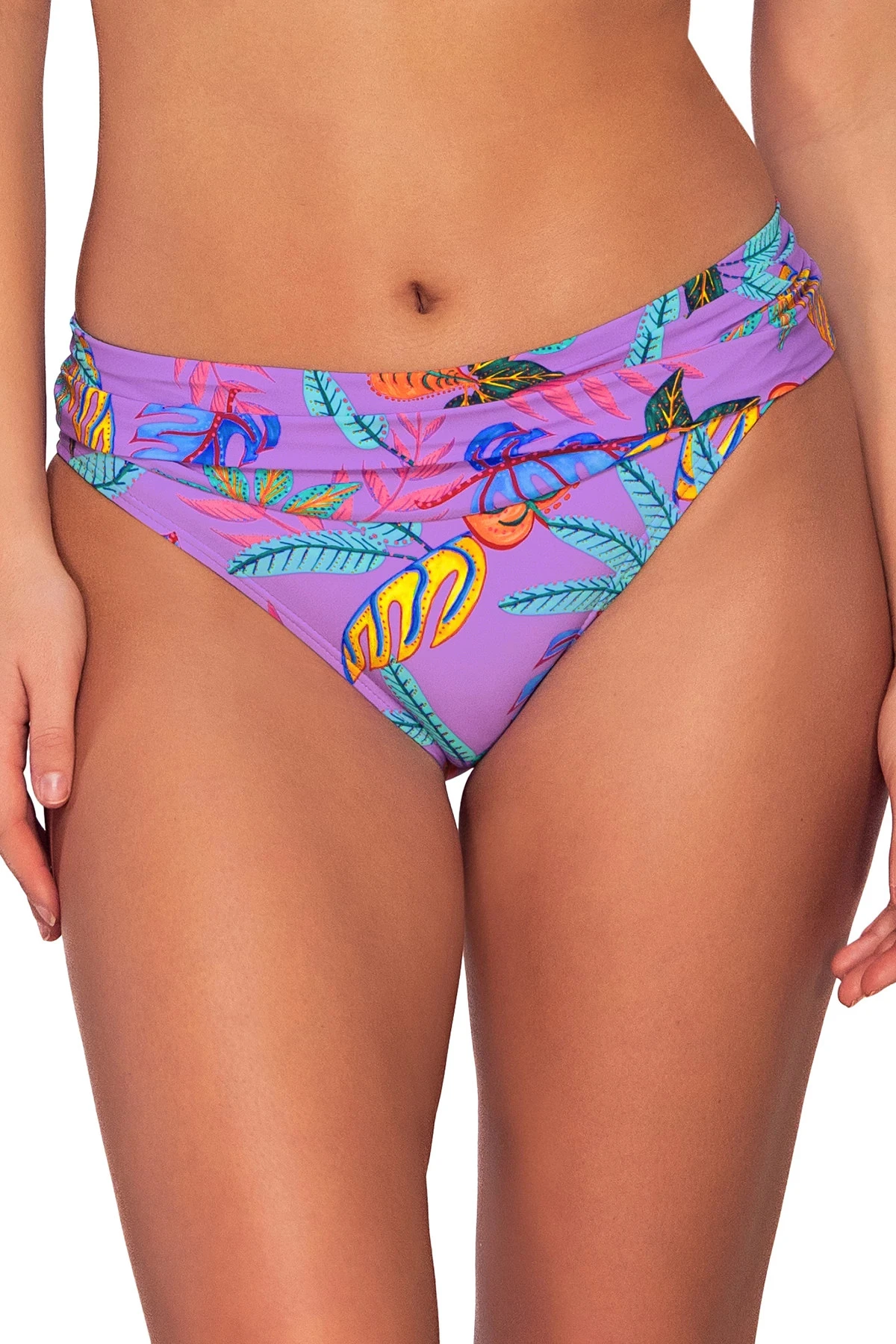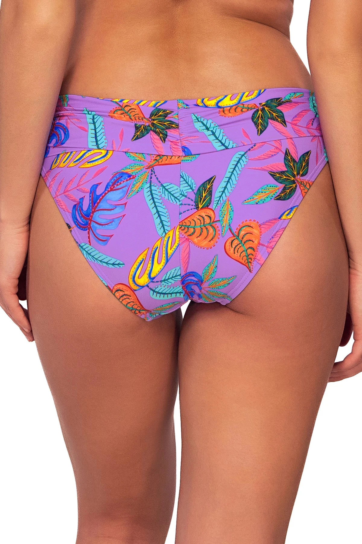 Add a little flair to your summer wardrobe in the unforgettable bottom. Features include shirred band with cinched back detail and matching front and back colored lining. Sits straight across the hip.