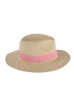 Vargas fedora hat features paper straw with colorful details woven in.