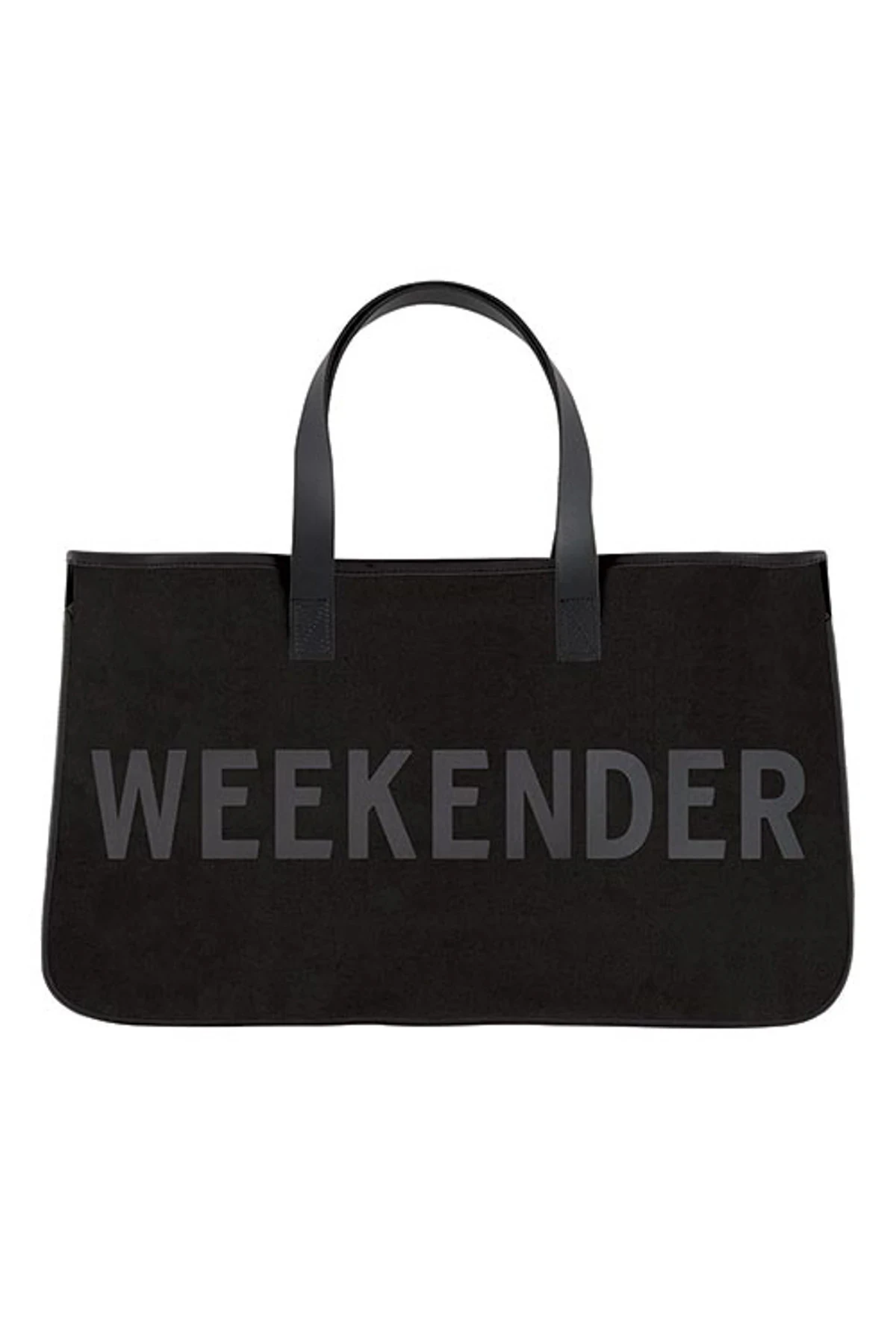 Tote features a bold “WEEKENDER” graphic with a waterproof lining, inside pocket and offers genuine leather top handles.