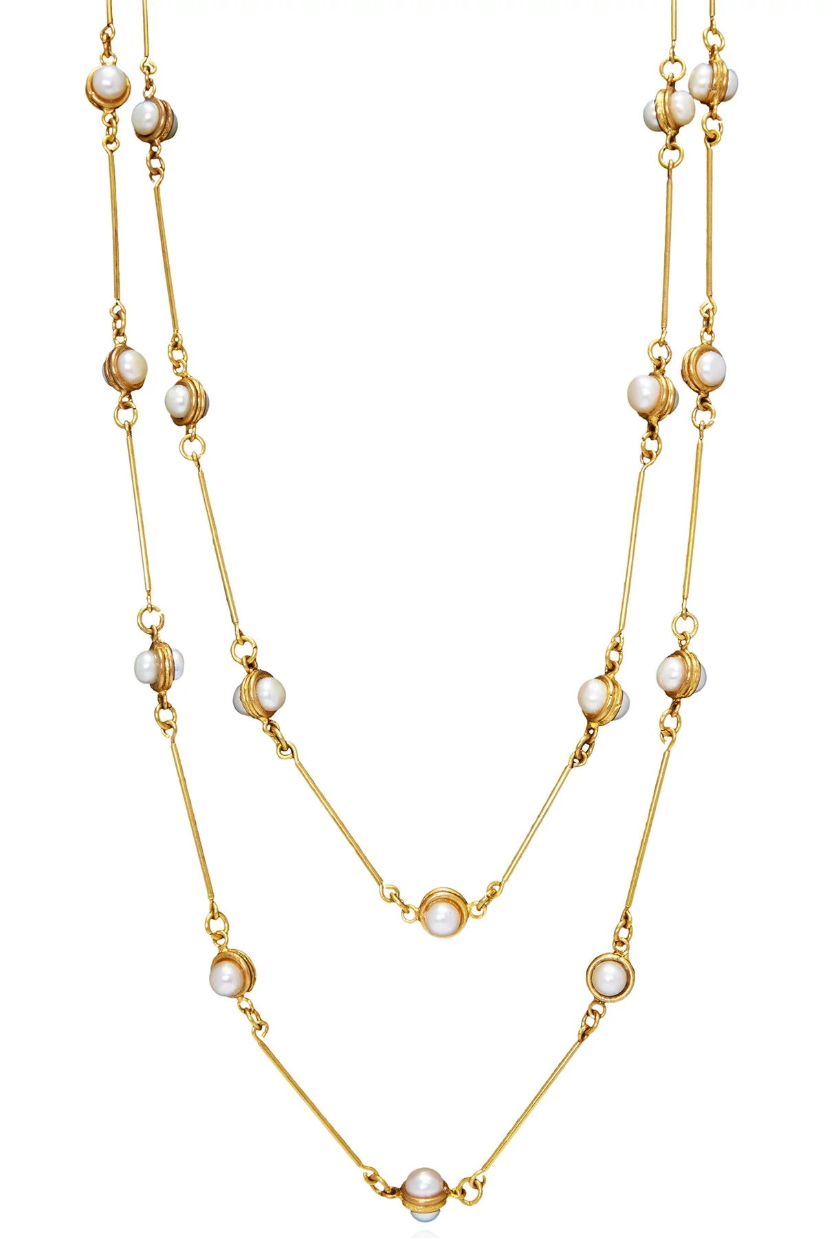 White Pearl Candies necklace is a double layered 22k gold-plated brass necklace featuring bezel-embellished freshwater pearls.